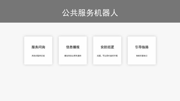 - 高鐵站+機器人解決方案 產品介紹 每當節假日,高鐵站客流大量增加,咨詢客服人員需要排隊等候,大大降低了高鐵站的服務質量。智能機器人可以高效完成服務問詢、位置指引,信息...